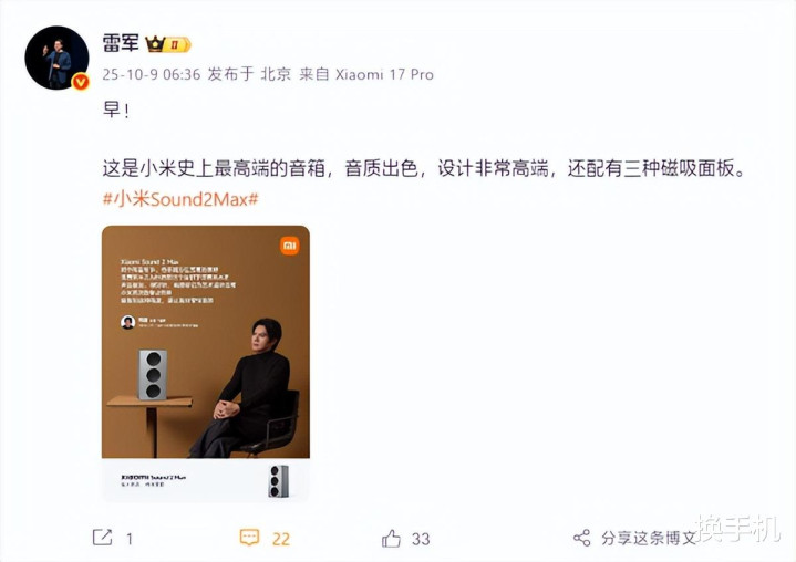 在国庆假期后的首个工作日,当许多人还在适应工作节奏时,小米创始人雷军便通过社交平台发布了一条种草消息——强力推荐小米旗下全新高端智能音箱Sound 2 Max。
